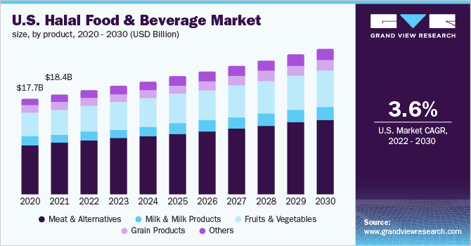 The global halal food and beverage market size was valued at USD 774.93 billion in 2021 and is expected to witness a compound annual growth rate (CAGR) of 3.6% from 2022 to 2030. The increasing Muslim population worldwide and growing concern regarding food safety, hygiene, and reliability will drive the market in the forecast period. According to an article published in Pew Research Centre, April 2019, there are 1.8 billion Muslims globally. With an increase in the demand, manufacturers have widened their product portfolio by introducing several value-added halal food items, including pasta, vegetable, juice, milk, yogurt, and cheese. Further, the production of halal-certified foods by key players in the market will increase product visibility among consumers.